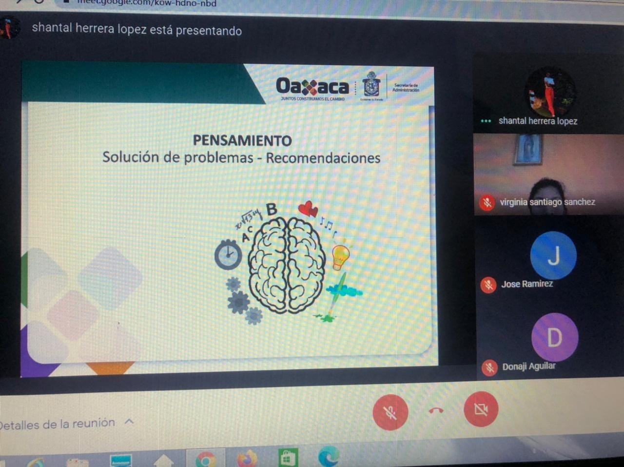 Mediante la impartición del taller, a distancia, “Comunicación Cerebral: Creatividad y Razón”, del Colegio de Estudios Científicos y Tecnológicos del Estado de Oaxaca, CECyTEO, a empleados de la Secretaría de Administración estatal, se les brinda capacirtación en la resolución de problemas.